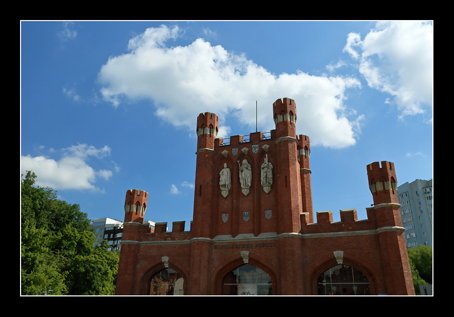 稍後,我們乘車到國王門。這是加里寧格勒原有的六個城門之一,建於1765年,為國王大街的終點。1850年,弗里德里希‧奧古斯特重新設計國王門。西立面有雕塑家威廉‧施蒂默爾創作的三個砂岩雕像,雕像上方為桑比亞半島和納坦吉亞的徽章。雖然當時正門背光,但如此有特色的名勝古蹟是仍然要拍照留念的。
