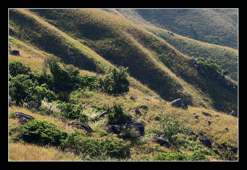 在沒有高樹的山嶺小路走著,最大樂趣是兩邊也是景色,令人目不暇給。當遠眺他人在雄偉大山的小路上行走,畫面很是吸引,令人生出許多聯想或啟發。途中除了起伏連線的山嶺好看外,還有些奇岩怪石星羅棋佈,拍攝題材層出不窮。翻過一個接一個山嶺後,看見一個滿佈多道傷痕的山坡,相信這就是越野電單車的主要「戰場」,慘不忍睹呢!拍攝完這個傷痕纍纍的山坡後,我就開始回頭。回程時迎面而來的遊人漸多,我大約十一時半走到山下。
